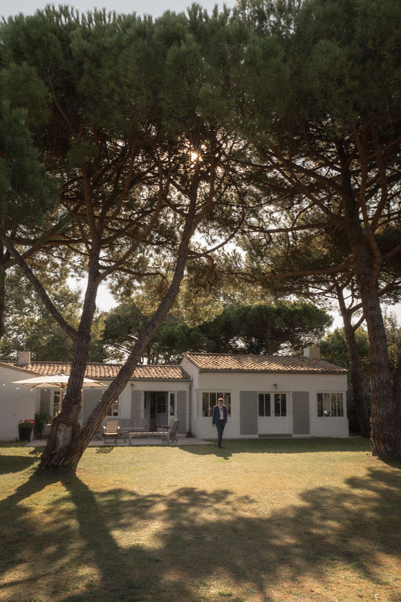 La villa qui accueillait ce mariage incarnait à la perfection l’esprit rétais : façade blanche rehaussée de volets verts, terrasse en bois, piscine bordée de végétation et en fond, l’horizon bleu de l’Atlantique. Un décor qui n’a besoin de rien d’autre que la lumière du jour pour être sublime.